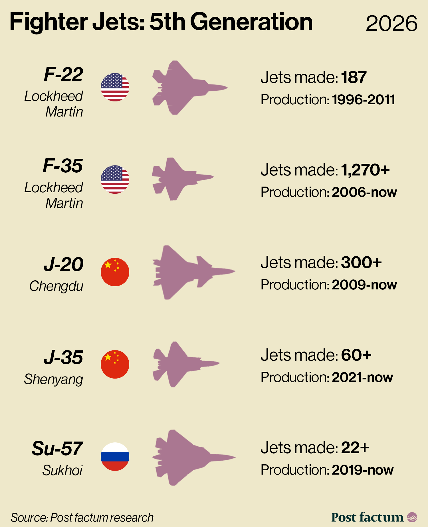 Su-57 (Russia): produced since 2019 at a slow rate, does not have advanced stealth.