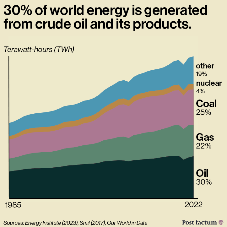Electricity is sometimes generated from burning oil products, and often from burning natural gas, which is extracted together with oil in many locations.