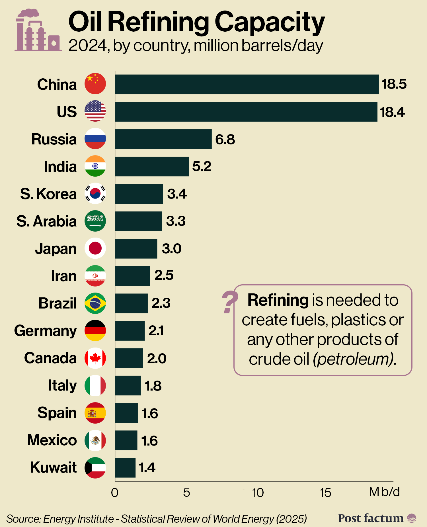 Refining helps China counteract its dependency on exporters of oil with their own demand for refined oil products.