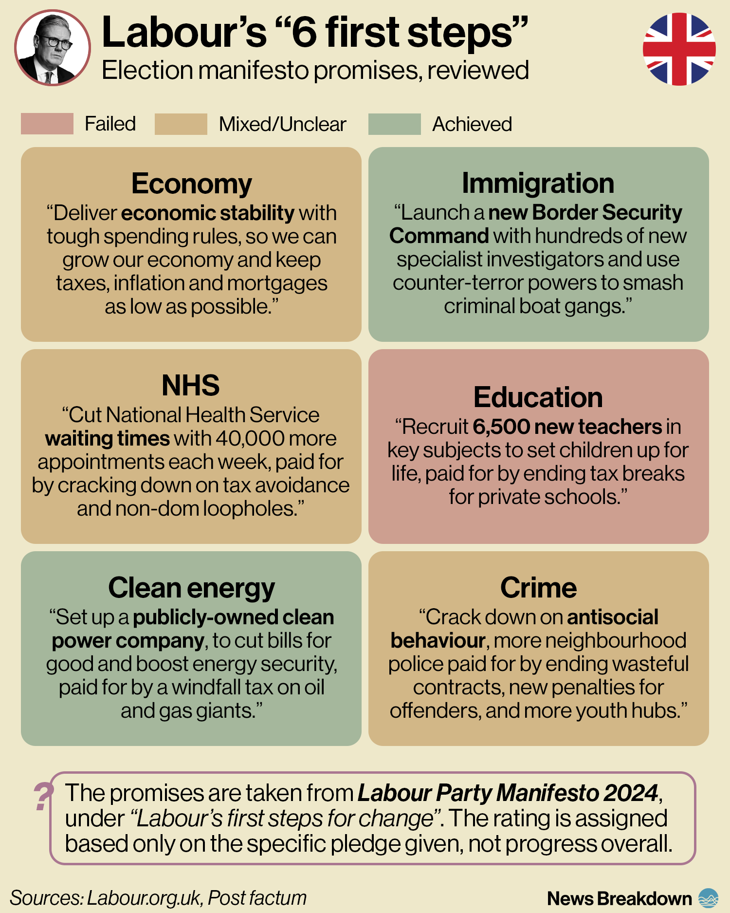 Education: The teacher recruitment target (6,500) was not met. Labour did end the VAT exemption for private school tuition.