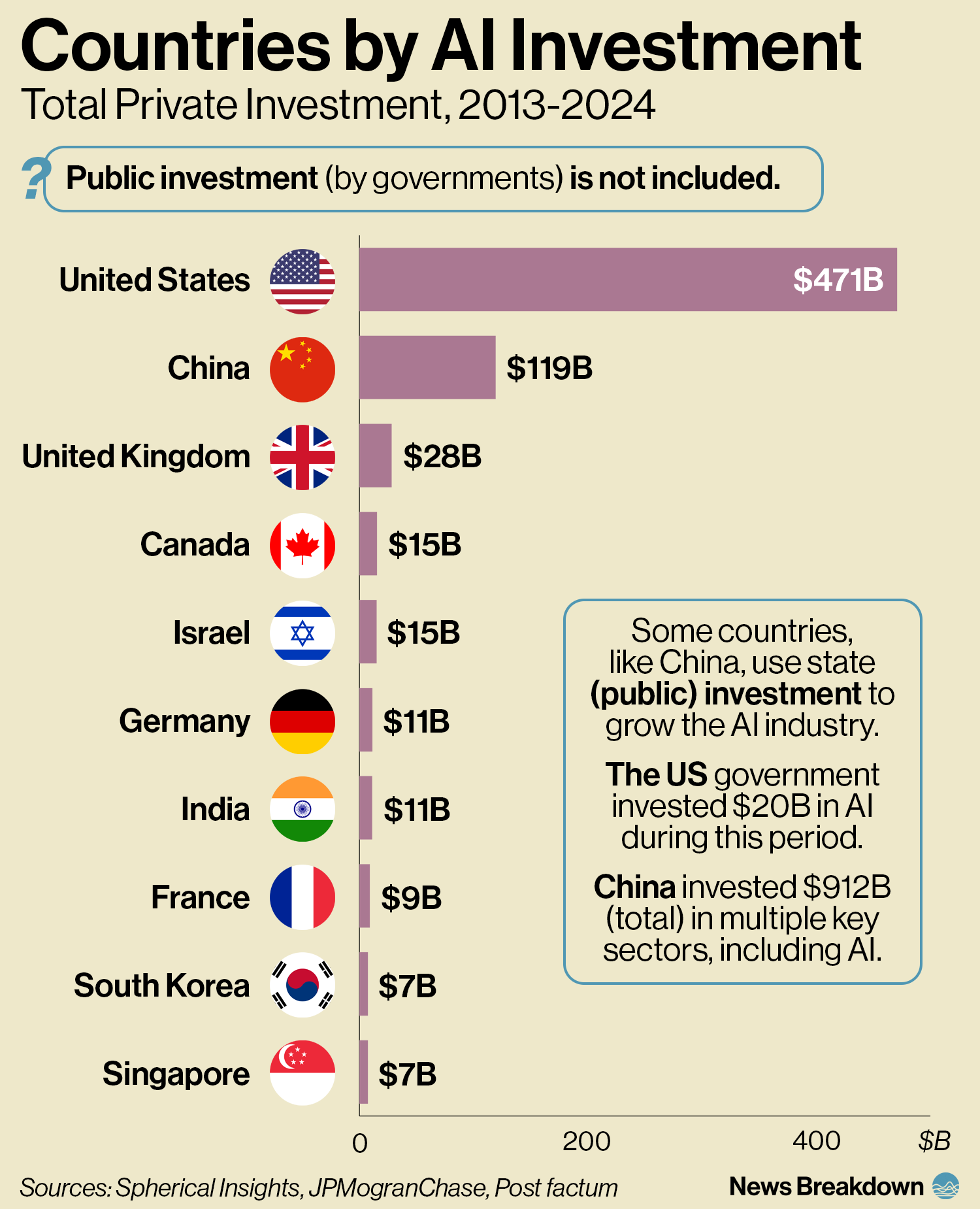 Multiple countries from the Middle East, such as Saudi Arabia and the UAE, have become major investors in AI companies globally.