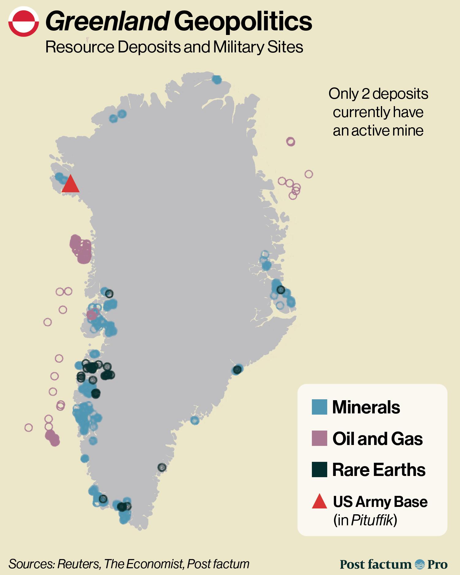 Greenland currently has 2 working mines: a gold mine reopened in 2024 and a mine producing material for fibreglass and paint.