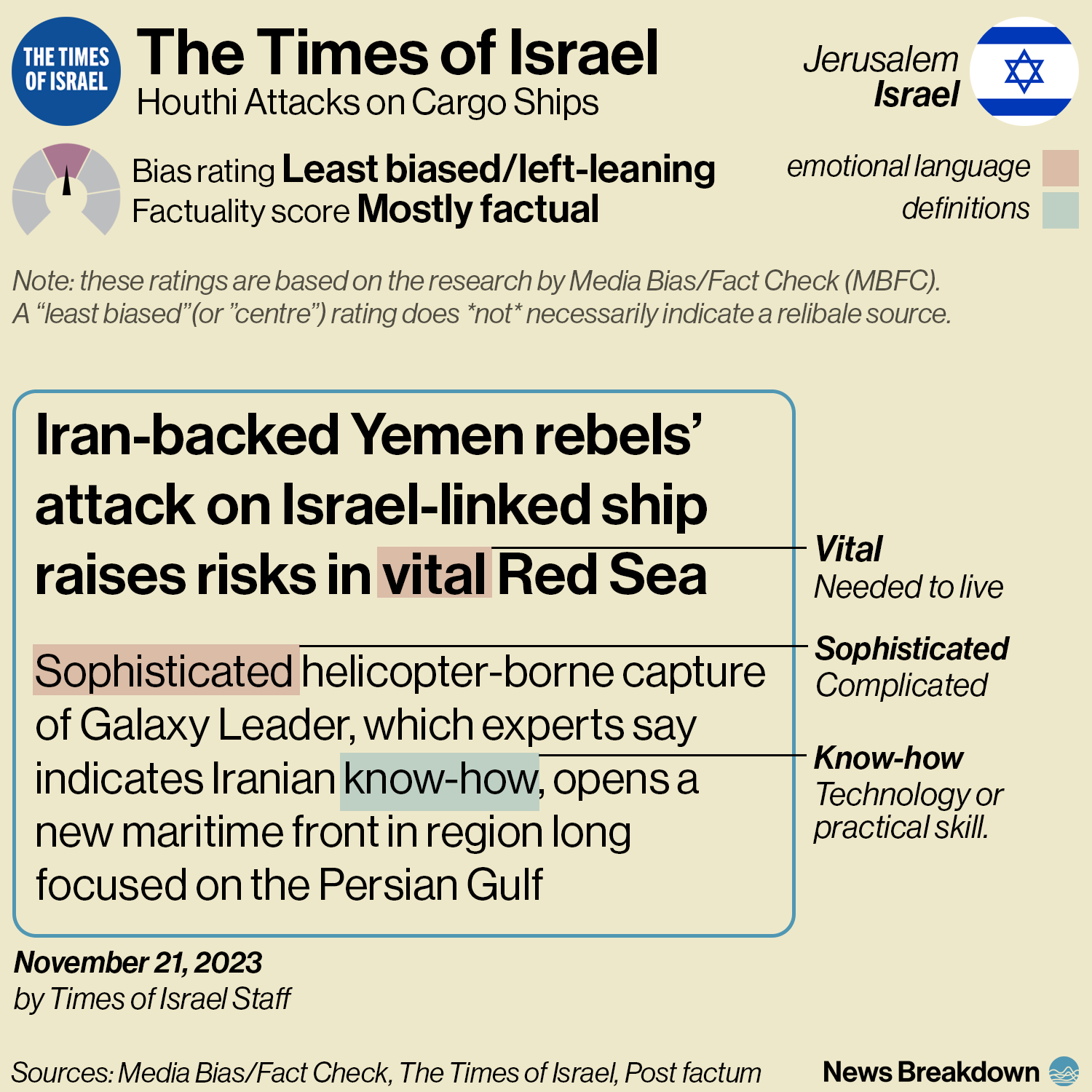 The article by ToI focuses on the potential involvement of Iran by supporting the Houthi’s attack.